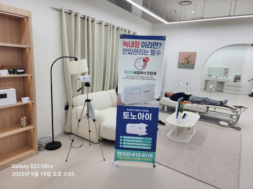 - 방문객들은 현장에서 ‘토노아이’를 직접 체험하며, 휴대성과 편의성에 대해 높은 만족도를 보였습니다. 부스에는 ‘녹내장이라면? 안압관리는 필수’라는 명확한 메시지를 담은 제품 안내판이 설치되어, 제품의 필요성을 강조했습니다.